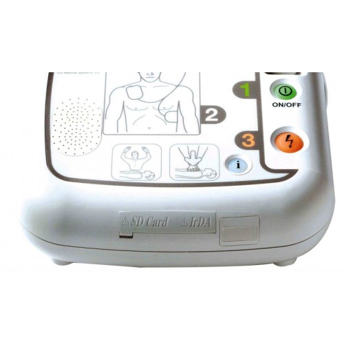 Batería desechable mínimo 200 descargas (según tipo y condiciones entorno) * Indicador de estado en pantalla * Ajuste automático de volumen según ruido ambiente * Electrodos inteligentes. Chequeo continuo de la caducidad de los mismos. Señal de aviso 3 meses antes de su caducidad * Práctico alojamiento para los electrodos. Compartimento accesible debajo del equipo. Siempre conectados * Mensajes de voz detallados e indicadores luminosos: Mensajes de voz para realizar el CPR en pacientes adultos y niños * Detección de realización de CPR. Aviso al usuario si o se detecta proceso de reanimación * Completa comunicación entre el CU-SP1 y el usuario mediante programa informático CU-EX1, para control de cada episodio * Transferencia de información con el usuario mediante tarjeta SD o puerto infrarrojos IrDA (opcional).