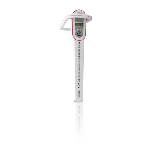 - Diseño elegante y sencillo manejo. - Consumo mínimo de pilas. - Fácil lectura. - Pantalla LCD con dígitos de 9mm. - Confirmación acústica. - Carcasa de plástico resistente. - Sensor de inclinación para corregir una posición incorrecta y aviso de error. - Medición por ultrasonidos, con compensación de temperatura.