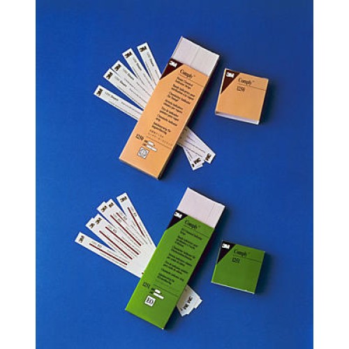 - La tira del indicador químico 3M 1251 es una tira de papel impresa con una tinta de indicador químico que cambia de rojo a verde cuando se la expone a óxido de etileno. - Está diseñada para indicar si el óxido de etileno ha penetrado hasta el centro del paquete. - Se debería usar un indicador químico para óxido de etileno conjuntamente con un indicador biológico para proporcionar información adicional. - El indicador químico 1251 esta diseñado para ser utilizado en los esterilizadores de óxido de etileno. - Cada tira está perforada en el centro, lo que permite dividir la tira en dos si se prefiere. Dimensiones: 1.5 x 20 cm.
