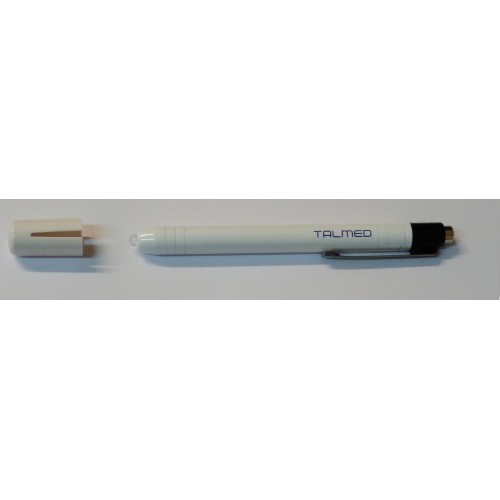 Cuerpo fabricado en aluminio blanco. Incorpora clip para colgar de la solapa o bolsillo. Se acciona mediante un pulsador de encendido o apagado, para mayor comodidad. Filtro azul desmontable. Presentación en envase individual.