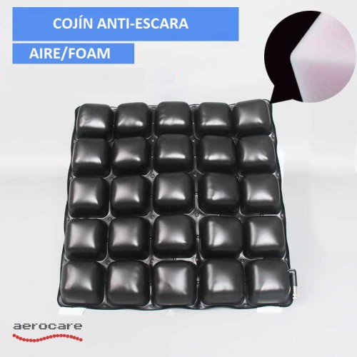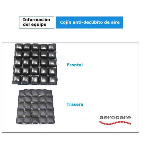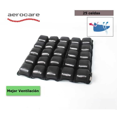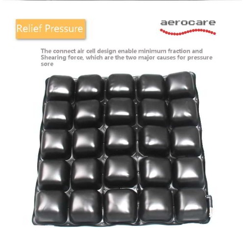 Gracias al cojín, la comodidad y la estabilidad del paciente están optimizadas porque la presión está distribuida en las caderas; esto ocurre incluso si el paciente está sentado muy hundido. El diseño de conexión entre celdas permite una fricción y fuerza de rozamiento mínima, que son las dos causas principales del dolor por presión. Las celdas de aire garantizan una postura del cuerpo equilibrada y estable sin causar el efecto mareo. El cojín de aire está fabricado con celdas de aire/foam en forma de mosaico. Este diseño hace que el aire se mueva entre los espacios de las celdas, permitiendo al cojín estar siempre seco y limpio.