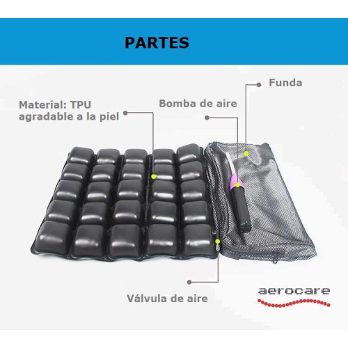 Medidas: 42x42x4.5cm, 25 celdas de aire. Foam incluido en cada celda, válvula de aire, Diseño único las celdas, conectadas como un todo para una mejor distribución del aire. Material: TPU agradable para la piel. Bomba de hinchado. Cubierta de calidad.